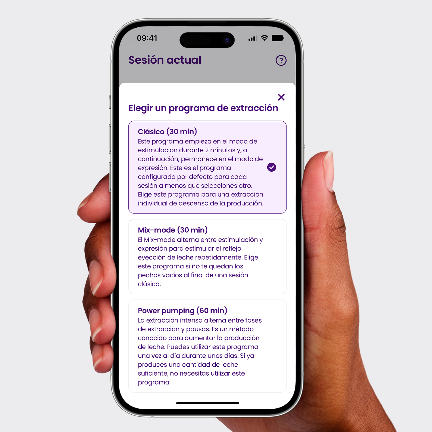El extractor de leche cambia automáticamente al modo de expresión, pudiendo programar la sesión con precisión.